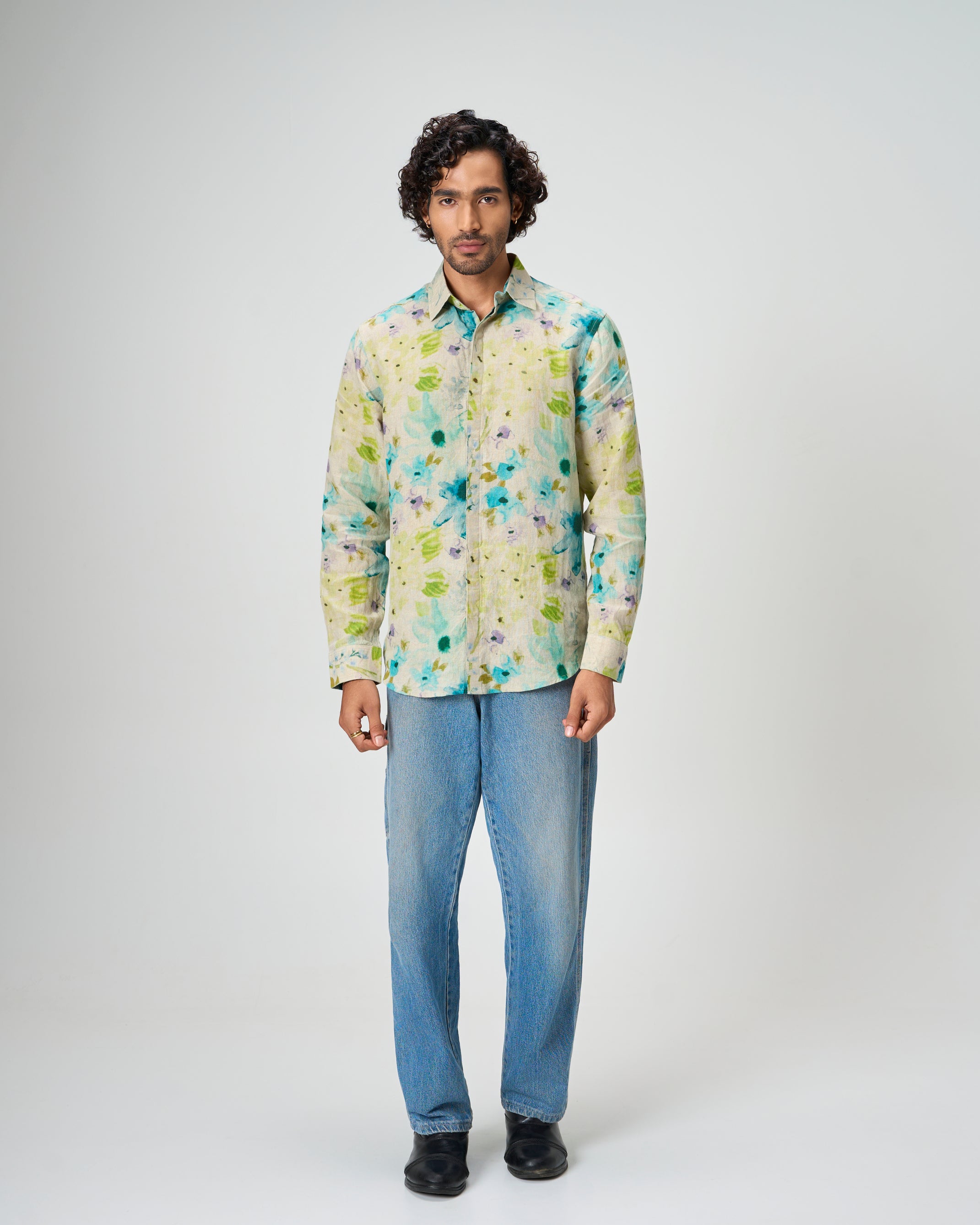 The shirt features a watercolor-inspired print, where soft blues, seafoam greens, and gentle violet tones blend seamlessly, evoking the delicate charm of Giverny’s famous lilies. Its relaxed fit enhances comfort while maintaining a refined, sophisticated silhouette, making it ideal for weekend leisure with denim or elevated with tailored white trousers for more formal occasions.