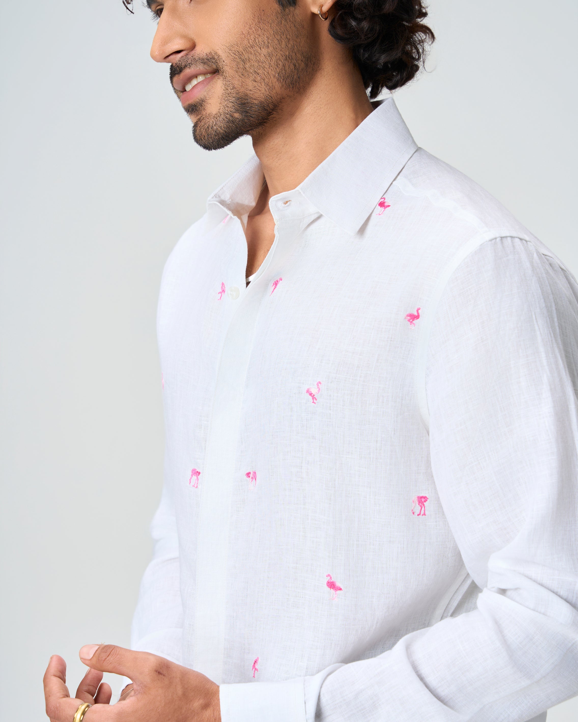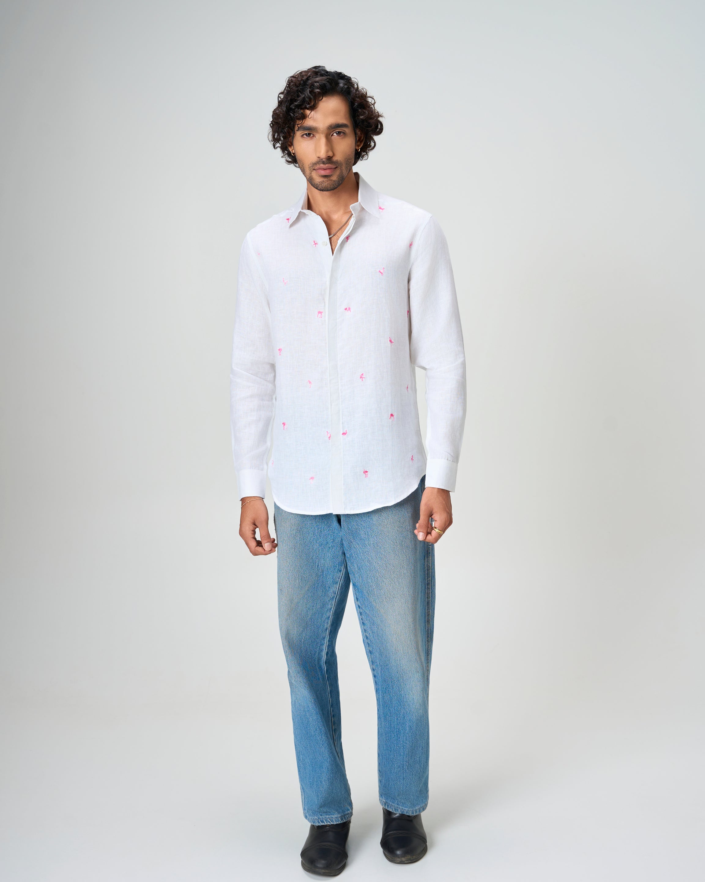 Crafted from soft, high-quality linen, the shirt is tailored for a smooth drape and exceptional breathability. Its signature feature, refined all-over micro-embroidery in a striking accent color — adds subtle texture and lighthearted charm, creating a polished look that doesn’t take itself too seriously. The embroidery is brought to life using the delicate technique of zardosi stitching with fine cotton threads, highlighting artisanal craftsmanship.